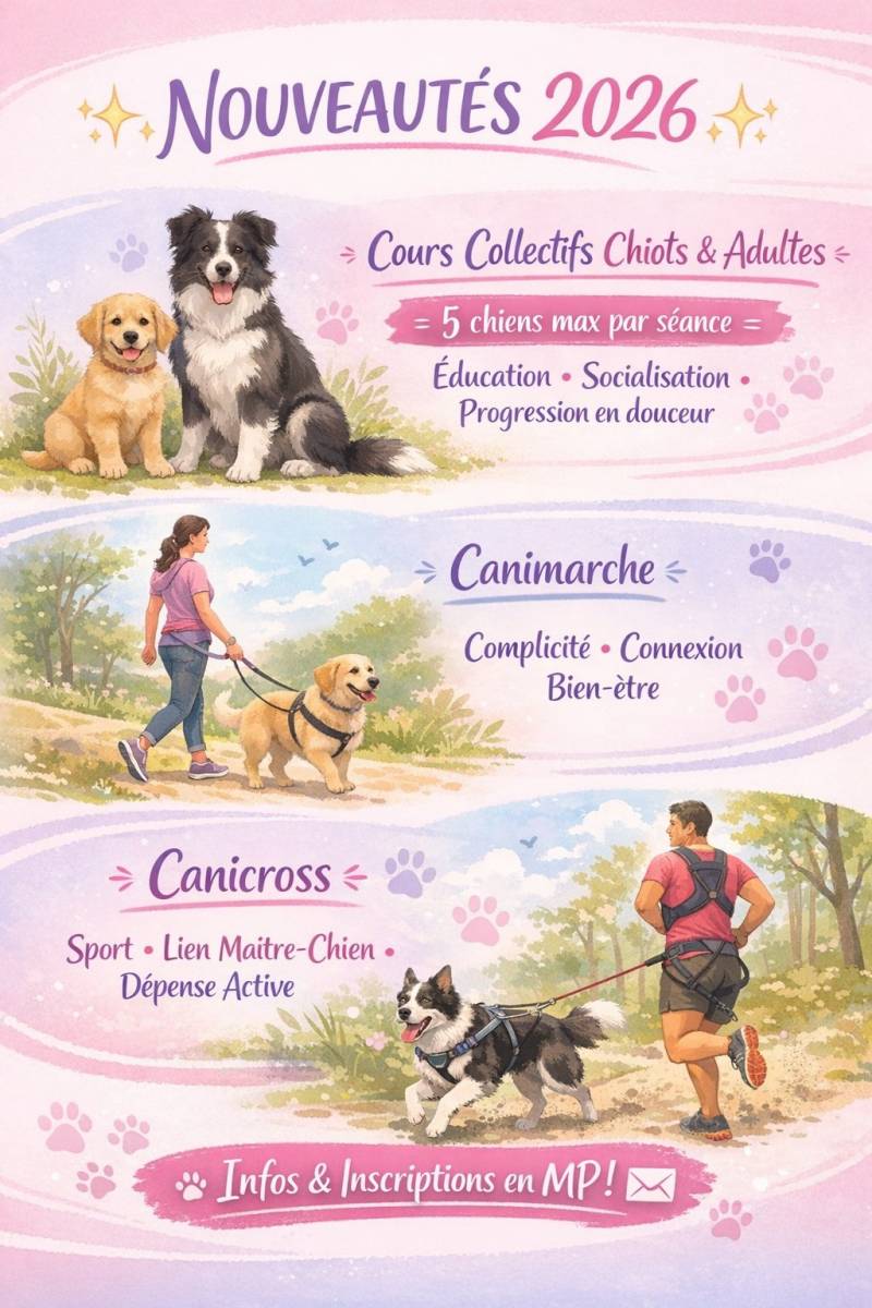 Des séances en petits groupes (5 chiens max) pour apprendre, progresser et socialiser en toute sérénité, dans le respect du rythme de chacun.